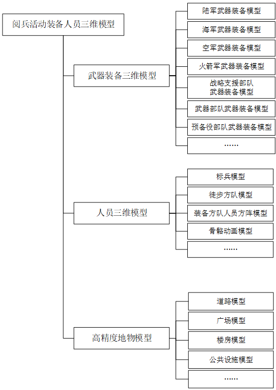针对阅兵推演等实际应用需求,构建的装备三维模型主要包括陆、海、空、火箭军、战略支援部队、武警部队、预备役部队等各类装备模型。