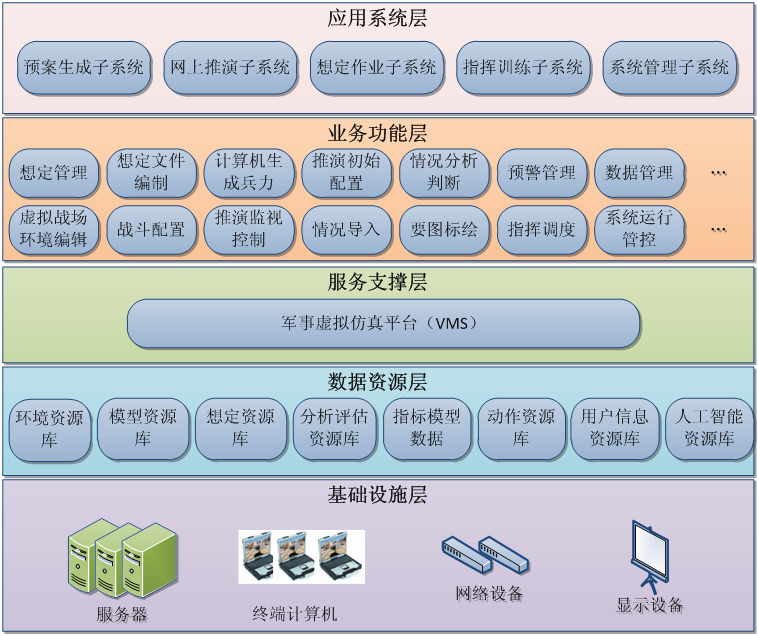 边防综合指挥训练系统是我司为解决边防指挥专业和兵种战术学学科建设人才培养的迫切需要,减少训练成本,提高训练人员的训练积极性。以公司自主研发的军事仿真训练平台(VMS)为支撑,形成预案生成子系统、网上推演子系统、想定作业子系统、指挥训练子系统、系统管理子系统等系统应用任务。