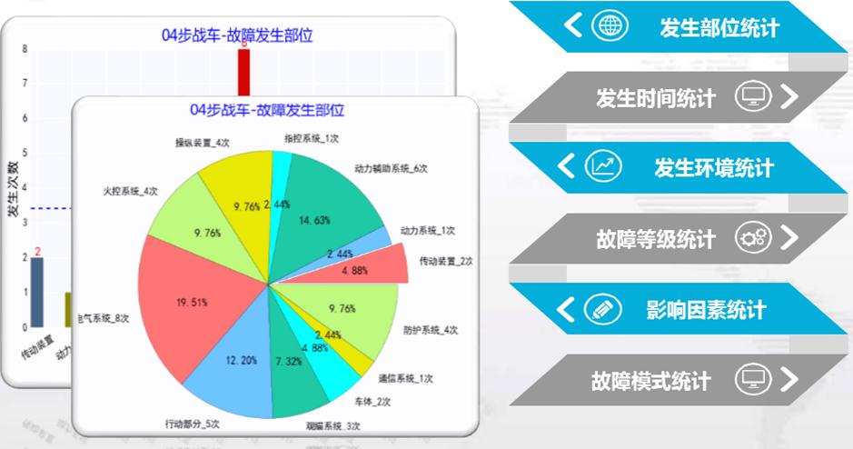 统计分析模型按照装备型号对故障数据按不同条目进行分类统计,提供针对故障发生部位、故障发生时间、故障发生环境、故障发生等级、故障消耗器材、故障影响因素、故障模式、故障原因发生次数以及装备部位出现故障概率的计算模型。