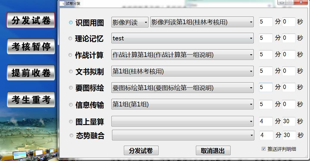 作战计算考核,系统提供作业想定条件,基于指挥信息系统和相关软件进行机动计算、火力毁伤计算、战斗力指数计算等作业; -