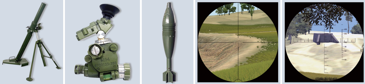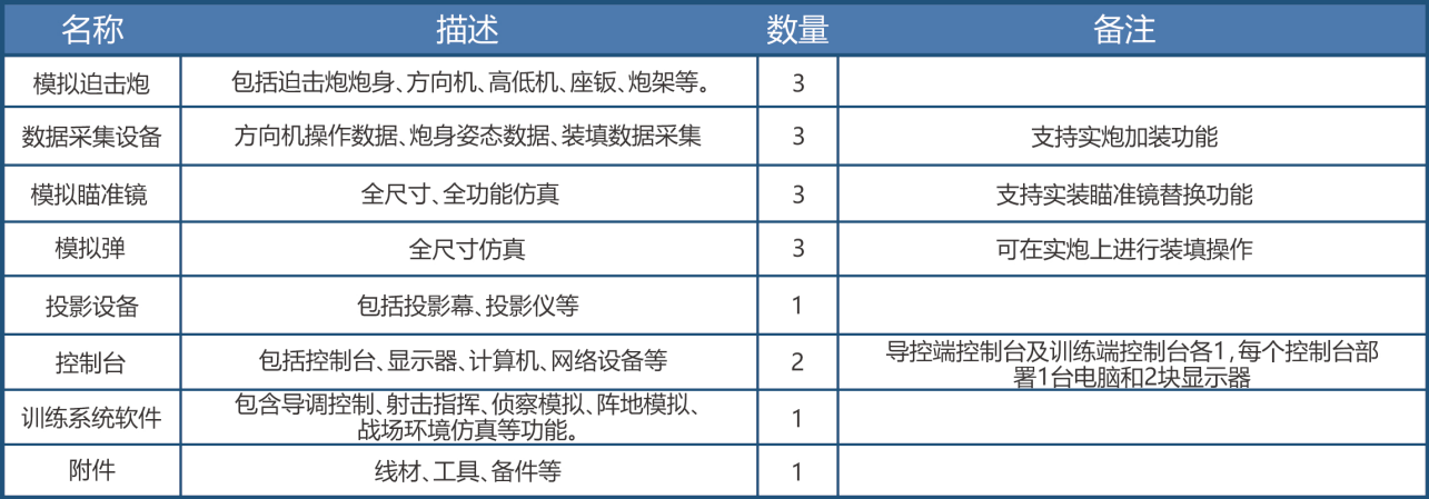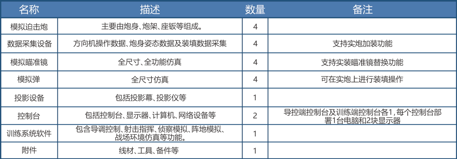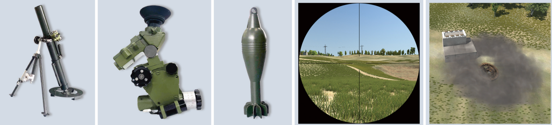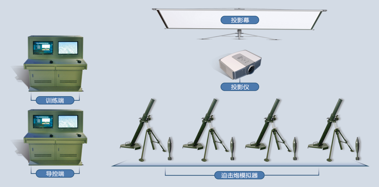60mm迫击炮射击模拟训练系统主要用于开展60mm迫击炮单炮及战炮班射击技能模拟训练、射击指挥模拟训练、射击协同模拟训练和观炮协同模拟训练。系统由3套迫击炮模拟器(每套迫击炮模拟器由模拟炮、模拟弹、模拟瞄准镜等组成),1部侦察、计算、指挥操作台(训练端),1部训练导调控制台(导控端),1套投影设备等硬件,以及模拟训练软件组成。系统能够构建与未来作战一致的实战化虚拟训练环境,并可实现高逼真度的武器弹道仿真及客观精确的训练结果分析评估,为部队迫击炮射击训练效益提升提供模拟技术与产品支撑。