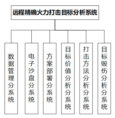 系统由“数据管理、电子沙盘、方案部署、目标价值分析、打击方法分析、目标毁伤分析”六个分系统组成。
