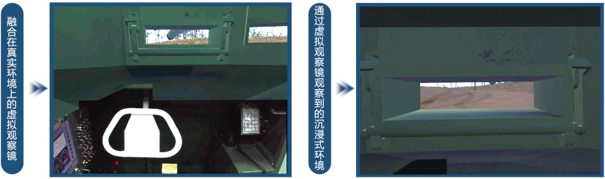 一是通过头戴式AR设备及融合仿真软件实现虚实融合仿真,将半实物仿真系统操作逼真与VR仿真系统沉浸式虚拟场景逼真的优势有机结合,驾驶员既能观察到仿真舱内的真实驾驶操作机件并进行操作,又能观察到融合在真实环境上的虚拟观察设备,并通过虚拟观察设备观察到外部的沉浸式三维虚拟环境,观察效果与通过实车观察设备对外观察时的效果一致,既可解决常规半实物仿真驾驶模拟器驾驶视景无纵深感、距离感,相对关系难判断等问题,又可解决VR驾驶模拟系统操作方式、操作感觉与实装操作方式和感觉偏差大等问题。