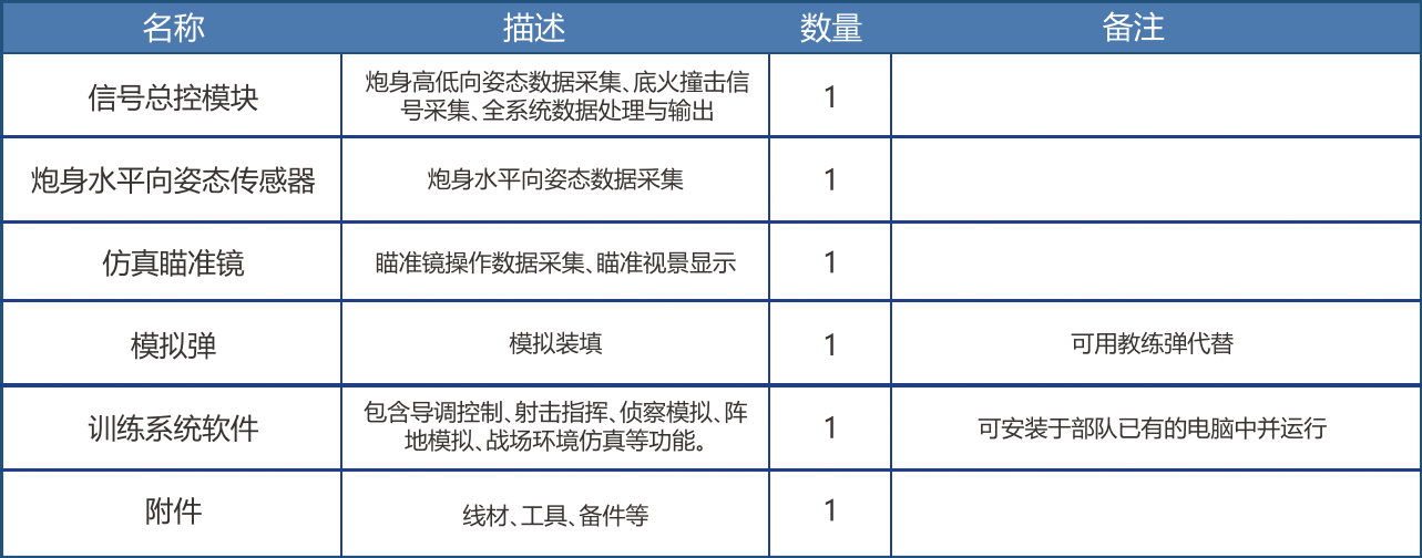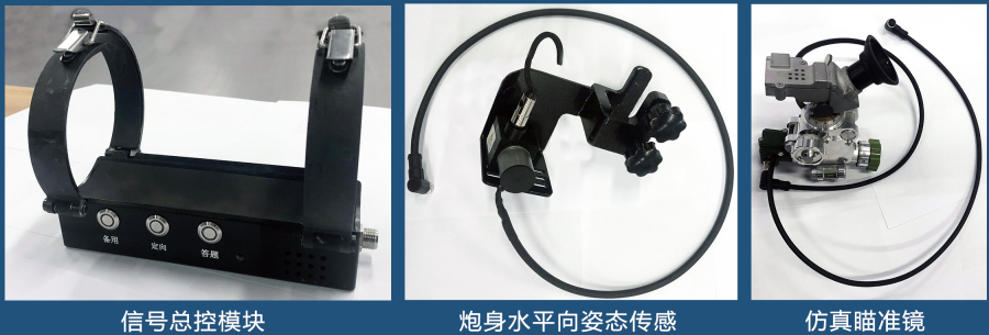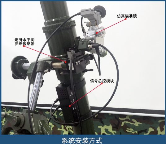 实装嵌入式迫击炮射击模拟训练系统由信号总控模块、炮身水平向姿态传感器、仿真瞄准镜、模拟弹(也可由教练弹代替)及数据线缆等组成,可以快速安装在迫击炮实装上,并利用部队已有的电脑、投影设备开展迫击炮射击模拟训练。系统支持100mm、82mm、60mm迫击炮嵌入式射击模拟训练。